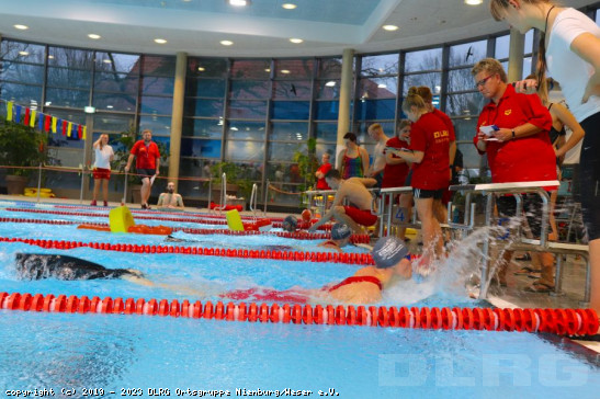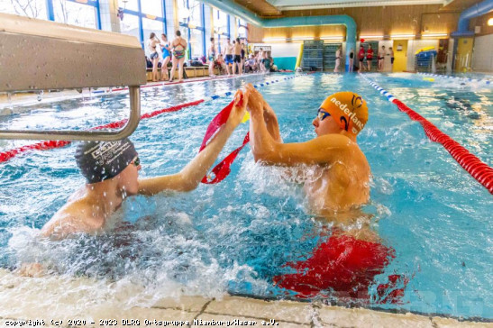 Zwei Tage Schwimmwettkämpfe im Dulsbergbad, dem Olympiastützpunkt Hamburg-Schleswig-Holstein, mit Einzel- und Mannschaftswettkämpfen liegen hinter den Rettungssportlern der DLRG Ortsgruppe Nienburg. Mit 20 Schwimmern nahmen sie an den offenen Hamburger Landesmeisterschaften im Rettungsschwimmen statt. Die Mannschaftswettkämpfe bildeten am Samstag den Auftakt auf der 50-Meter-Bahn. Hier schnitt aus Nienburger Sicht die Mannschaft in der Altersklasse (AK) 12 männlich mit Platz zwei in der Mehrkampfwertung am besten ab. Auch die AK 13/14 weiblich konnte sich behaupten und landete am Ende auf Platz drei in ihrer Klasse. Stark für diese AK waren u.a. die Staffelwechsel in der Puppenstaffel: Nach 25 Metern in der Bahnmitte die 60kg schwere Rettungspuppe zu übergeben, bzw. anzunehmen, liest s ... Mehr erfahren